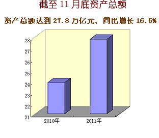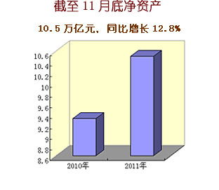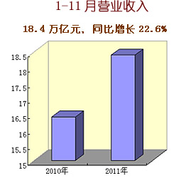 2011年中央企業認真貫徹落實黨中央、國務院各項決策部署,生產經營總體上保持平穩較快增長,主要經濟指標創歷史新高。1-11月,累計實現營業收入18.4萬億元,同比增長22.6%;累計實現凈利潤8317.9億元,同比增長3.6%;上交稅金1.52萬億元,同比增長24.8%,增速比營業收入高2.2個百分點,比凈利潤高21.2個百分點;截至11月底,中央企業資產總額達到27.8萬億元,同比增長16.5%;凈資產10.5萬億元,同比增長12.8%。