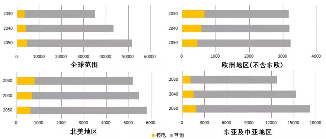 編者按:我國力爭2030年前實現碳達峰、2060年前實現碳中和,是黨中央經過深思熟慮作出的重大戰略決策,事關中華民族永續發展和構建人類命運共同體。能源領域碳排放總量大、占比高,是實現綠色低碳轉型和高質量發展的關鍵。公司能源業務部成立了以張宗玟等部門領導為核心、以青年黨員為骨干的“3060”研究小組,貫徹新發展理念和能源安全新戰略,對以新能源為主體的新型電力系統、碳排放和水電、新能源、核電、儲能、煤炭等方面高質量發展進行了探索性研究,以推動構建清潔低碳安全高效的能源體系。為促進研究成果的應用,本公眾號將核心研究成果以系列文章的形式陸續刊發,供業界同仁參考。 “雙碳”背景下核能高質量發展的挑戰與對策 黃文 謝千 鄭保軍 摘要:核能具有清潔低碳、出力穩定、邊際成本低等特征,且發展沿海核電的部署與我國經濟布局深度契合,是能源供給側尤其是新增非化石能源中最有望兼顧“低碳、經濟、安全”矛盾三角的能源形式,能通過規模化發展替代化石能源,并與新能源形成強互補發展。本文以“雙碳”目標(碳達峰、碳中和)及“兩個構建”(構建清潔低碳安全高效的能源體系、構建以新能源為主體的新型電力系統)為準繩,總結提出核能在未來“雙碳”戰略目標下的挑戰和對策建議,以期促進未來核能高質量發展。 關鍵詞:“雙碳”戰略目標;核能;高質量發展;創新;高效;挑戰 一、引言 2020年9月22日,國家主席習近平在第七十五屆聯合國大會一般性辯論會上做出“碳達峰、碳中和”鄭重承諾,首次提出了我國“二氧化碳排放力爭于2030年前達到峰值,努力爭取2060年前實現碳中和”的“雙碳”戰略目標。該戰略目標體現了我國將攜手世界積極應對全球氣候變化這一巨大挑戰的堅定決心,也彰顯了我國在構建人類命運共同體上的大國責任與擔當,這些都為新冠肺炎疫情后的全球綠色發展和協調共贏注入強大信心。已有研究指出,中國“雙碳”戰略目標的順利實現,將有效推動全球溫升趨勢的改變,使得全球溫度將比預期降低0.3℃甚至更高[1]。 自進入21世紀以來,我國經濟快速發展,我國的碳排放量也在快速攀升。相關研究數據[2]顯示,2019年我國碳排放量約115億噸,約占全球總排放量的30%,位居全球第一,較2000年我國碳排放量提高約168%。21世紀以來我國的碳排放量和GDP增長情況見下圖1。 圖1 21世紀以來我國的碳排放量和GDP增長情況 目前我國相關研究領域總體上對2060年“碳中和”背景下的碳排放限值已達成一定共識[3]。據有關研究機構的預測[2],我國若要實現基準的“1.5℃情景”下的減排目標,2050年后允許碳排放值僅為當前碳排放量的15%~25%,即使在“退而求其次”、可行備用的“2℃情景”下,允許碳排放值也僅為當前碳排放量的40%~50%,并低于2000年我國碳排放量。而目前,我國經濟仍處于中高速、高質量發展階段,能源消費量還在增長,碳排放量還有增加的可能,需要經歷2030年前“碳達峰”,才能走向2060年的“碳中和”。相比發達國家,我國“碳達峰”到“碳中和”間隔僅有30年時間,減排強度及困難程度在全球范圍首屈一指。未來我國碳的達峰和減排情景設想見下圖2。 圖2 未來我國碳的達峰和減排情景設想 而實現“雙碳”戰略目標首當其沖的就是能源產業。據統計,2019年我國能源供給側的碳排放量約46億噸,占比約40%;能源消費側(僅工業領域)的碳排放量約33億噸,占比約30%,合計貢獻已達70%,是我國二氧化碳排放的主要來源[3]。構建清潔低碳安全高效的能源體系、構建以新能源為主體的新型電力系統,實現能源產業“低碳”甚至“零碳”轉型發展,是我國實現“雙碳”戰略目標的重要保障和前提,也是未來能源產業適應我國新時期高質量發展目標的重大要求和長久研究方向。 二、核能是我國能源和電力統籌發展的戰略性保障 近年來,隨著我國穩步實施“兩個構建”,我國風能和太陽能等可再生能源成為增速最快的能源。2020年,我國風能發電裝機容量約2.82億千瓦,太陽能發電裝機容量約2.53億千瓦,較2015年分別增長約1.2倍和4.8倍;預計2025年、2030年、2035年,我國風能發電裝機規模有望達到4億、6億、10億千瓦,太陽能發電裝機規模有望達到5億、9億、15億千瓦[3][5]。 但是,過往數十年來世界各國能源和電力發展實踐和研究成果均表明,能源結構的低碳化是一個漫長、復雜、曲折的過程。可再生能源固有的能量密度低、發電不穩定等特征,使其在大規模發展下仍將面臨一些短時期內無法回避的現實瓶頸或問題。如新能源大發時段需要大量可控電源深度調節以保障消納,在熱潮、寒潮等特殊天氣需要電力穩定供應時往往又出力下降,甚至出現如2021年7月28日東北電網風電的短時最低出力不足網內風電裝機千分之一的極端情況。 而從全球尤其是發達國家過往發展經驗和未來發展策略等來看,能源和電力系統將呈現多種能源形式并存的局面,可再生能源、核能、儲能等新型能源形式與必要的化石能源等不同能源并存互補,各自發揮自己的優勢,為全球和各國經濟和社會發展提供充足的能源和電力保障。全球及典型地區能源消費和電力供應情況及未來預測[6]見下圖3~圖6。 圖3 全球及典型地區能源消費情況(單位:EJ) 圖4 全球及典型地區電力供應情況(單位:TW·h) 圖5 全球及典型地區能源消費預測(單位:EJ) 圖6 全球及典型地區電力