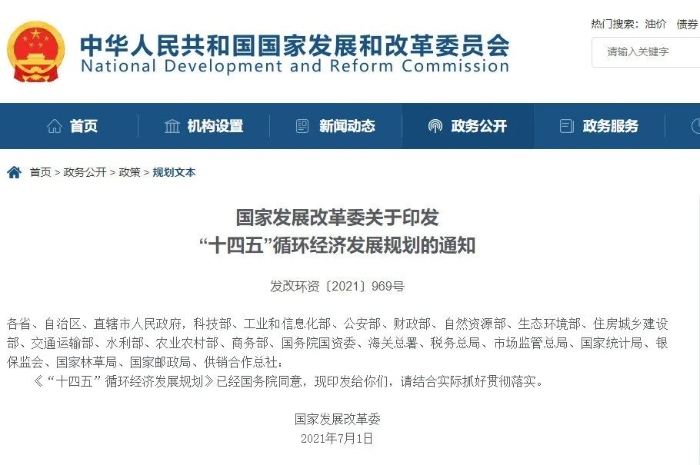 保障資源安全 助力雙碳目標 ——《“十四五”循環(huán)經(jīng)濟發(fā)展規(guī)劃》解讀 近日,經(jīng)國務院同意,國家發(fā)展改革委印發(fā)了《“十四五”循環(huán)經(jīng)濟發(fā)展規(guī)劃》(發(fā)改環(huán)資﹝2021﹞969號,以下簡稱《規(guī)劃》),全面部署了今后一段時期我國循環(huán)經(jīng)濟發(fā)展的總體思路、主要任務、重點工程行動和保障措施,指明了“十四五”循環(huán)經(jīng)濟發(fā)展路徑,對于推進循環(huán)經(jīng)濟發(fā)展,構建綠色低碳循環(huán)的經(jīng)濟體系,助力實現(xiàn)碳達峰、碳中和目標意義重大。
