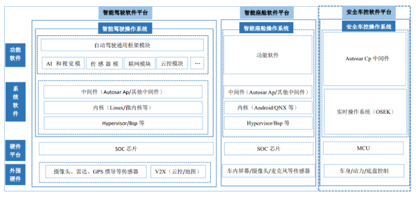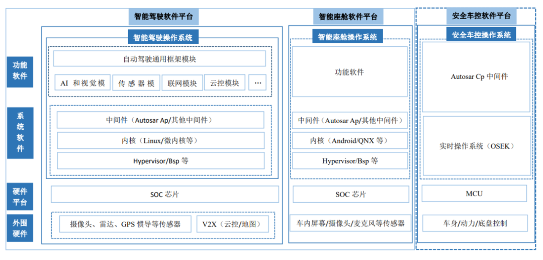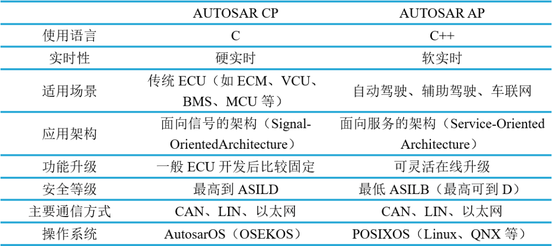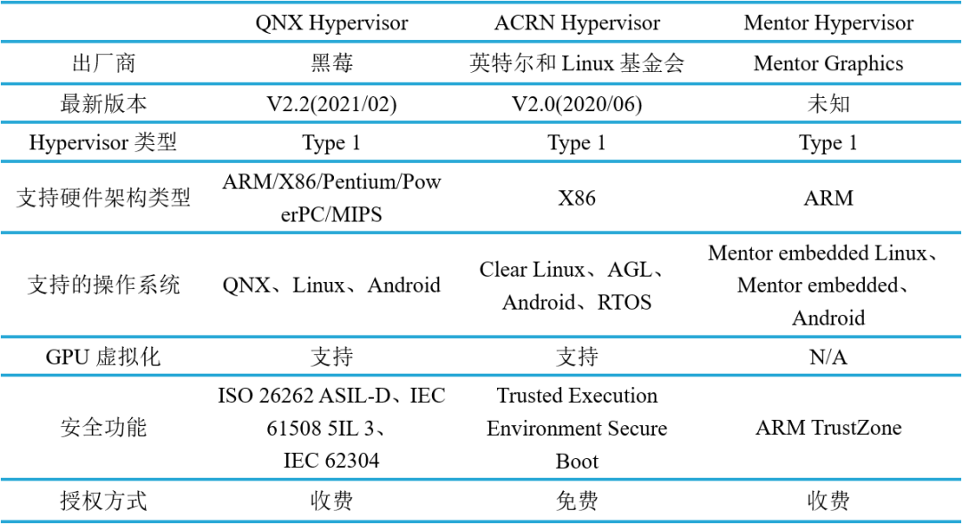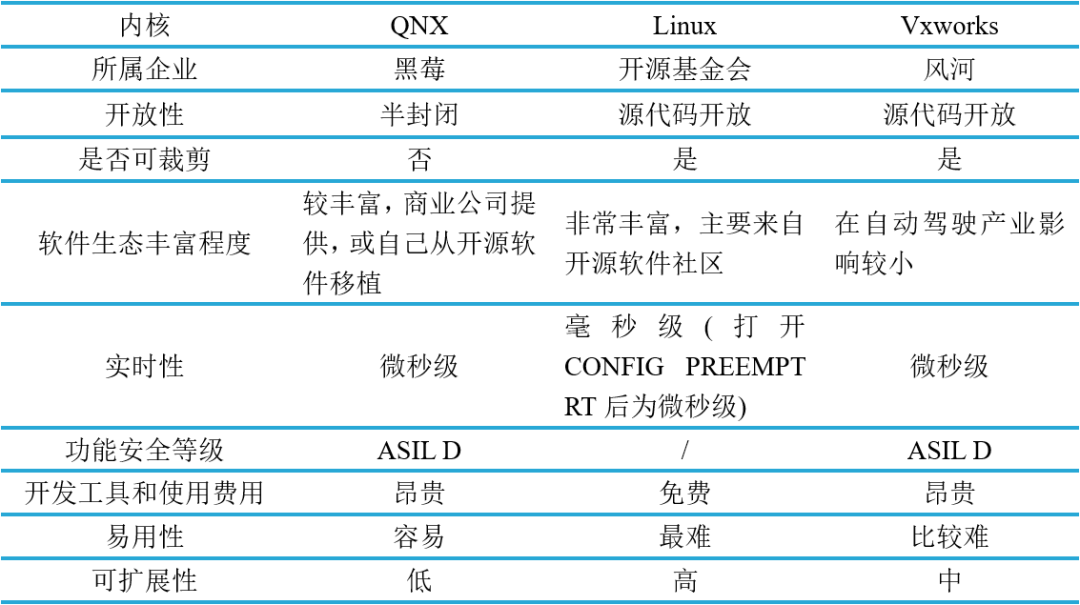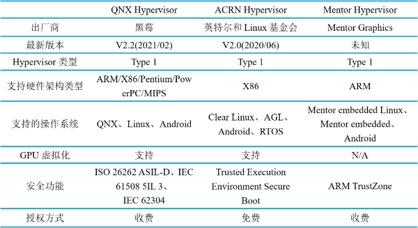 車用操作系統技術現狀及發展趨勢 汪志鴻 馬天澤 陳炳全 摘要:隨著汽車向電動化、智能化發展,其電子電氣架構正從傳統分布式架構向域集中式架構以及中央計算架構轉變,汽車軟件由面向信號的架構朝面向服務的軟件架構升級。車用操作系統是汽車軟件生態的重要基礎,加強車用操作系統技術研究對保障我國智能汽車產業安全具有重要意義。基于此背景,本文對車用操作系統技術架構、典型產品以及發展現狀進行了梳理,對比了國內外主流虛擬化技術產品、內核、中間件,提出了車用操作系統未來發展趨勢。 關鍵詞:車用操作系統;內核;技術現狀;發展趨勢 一、車用操作系統架構概述 車用操作系統與芯片、傳感器等物理硬件共同組成車載基礎軟硬件平臺,是實現智能駕駛、智能座艙、安全車控功能的基礎。按上述功能劃分,車載基礎軟件平臺可以分為智能駕駛、智能座艙、安全車控等三個軟件平臺,分別由智能駕駛操作系統、智能座艙操作系統、安全車控操作系統以及相應的配套工具鏈組成。 智能駕駛和智能座艙操作系統按架構自下而上均可分為系統軟件和功能軟件。其中,系統軟件可以分為硬件抽象層、內核和中間件;功能軟件可以分為AI和視覺模塊、傳感器模塊、聯網模塊、云控模塊、自動駕駛通用框架模塊等。安全車控操作系統是指面向傳統車輛控制,基于OSEK OS(汽車電子開放式系統及接口)和AUTOSAR CP(傳統汽車開放架構平臺)構建,實現車身、動力、底盤系統等控制功能。車用操作系統架構如圖1所示。 圖1 車用操作系統架構 車用操作系統中的系統軟件不僅為上層應用以及功能的實現提供了高效、穩定的環境支持,也是各類應用調度底層硬件資源的“橋梁”,在智能汽車整體軟件架構中處于基石位置。本文將重點介紹系統軟件。 二、系統軟件技術發展現狀 系統軟件是針對汽車場景定制的復雜大規模嵌入式系統運行環境,主要包含硬件抽象層、內核、中間件三層。 (一)硬件抽象層 1.概念 硬件抽象層是內核與硬件之間的接口層,目的是為操作系統提供虛擬硬件平臺,使操作系統與硬件解耦,實現多硬件平臺間的移植。虛擬硬件平臺由虛擬機(簡稱VM)和虛擬機監視器(簡稱Hypervisor)構成,操作系統在VM上運行,并通過Hypervisor進行調度。 虛擬機是指通過軟件模擬完整的硬件系統功能,實現操作系統運行在一個完全隔離環境中。在物理硬件中能夠完成的工作都能夠在虛擬機中實現。 Hypervisor是指一種運行在物理硬件和虛擬機之間的中間層軟件,可以允許多個虛擬機和應用共享一套基礎物理硬件,用于協調訪問物理設備和虛擬機,所以又稱為虛擬機監視器。Hypervisor主要有兩種,Type 1(裸機類型)和Type 2(寄居類型),Type 1類型的Hypervisor直接運行在物理硬件之上,可直接訪問物理硬件并管理所有硬件資源,在延時、安全性和效率上更勝一籌,但此類型Hypervisor需要硬件支持,移植難度大,開發成本也較高;Type 2類型的Hypervisor運行在某個操作系統之上,通過操作系統訪問物理硬件,因此在延時方面具有不可避免的劣勢,并且底層操作系統的任何問題都將危及其上的虛擬機,因此安全性方面相對較弱,但是移植難度小,開發成本低。Type 1和Type 2架構如圖2所示。 2.典型虛擬監視器 Hypervisor目前主要應用于智能座艙操作系統,未來將逐步向智能駕駛操作系統擴展。在智能座艙操作系統中,娛樂和智能交互等模塊與儀表顯示等模塊對實時性、安全性、穩定性要求不同,需要在一顆SOC芯片上運行兩種或多種操作系統。因此,目前主流Hypervisor方案選擇Type 1型,保障操作系統之間互不干擾,提升操作系統安全性。典型虛擬監視器包括QNX Hypervisor、ACRN Hypervisor、Mentor Hypervisor等,均為基于Type 1型的虛擬管理程序。各類Hypervisor對比如表1所示。 3.國內外虛擬監視器市場格局 近幾年涌入車載Hypervisor領域的企業非常多,以國外企業為主,主要產品包括加拿大黑莓公司的QNX Hypervisor、英國XenSource公司的Xen Hypervisor、日本松下旗下子公司的OpenSynergy、Linux基金會的ACRN Hypervisor、美國Mentor Graphics公司Mentor Hypervisor等。其中,QNX Hypervisor是目前唯一應用到量產車型且功能安全等級達到ISO 26262 ASIL-D級的虛擬抽象層產品,并支持高通、恩智浦、德州儀器等廠商的芯片。同時,黑莓與博世等多家Tier 1(一級汽車供應商)廠商建立了合作伙伴關系,推廣其Hypervisor產品。此外,高通在Snapdragon Ride自動駕駛軟件堆棧中也選擇了QNX Hypervisor 2.0版本產品。 國內Hypervisor發展相對落后,2017年中科創達、誠邁科技入選黑莓VAI計劃,作為合作伙伴可以使用黑莓的嵌入式技術,開發集成服務、安全關鍵型解決方案。阿里斑馬智行在自研虛擬機監控技術AliOS Hypervisor。中興通訊自研Hypervisor產品,并已實現量產裝車應用。 (二)車用操作系統內核 內核是操作系統的核心部分,提供內存管理、文件管理、CPU調度管理、輸入輸出管理等功能,管理系統的各種資源。內核可以按照內核結構、實時性以及對內核改造程度三個維度進行分類,按照內核結構劃分,分為微內核和宏內核;按照實時性劃分,分為實時操作系統和分時操作系統;按照對內核改造程度劃分,分為基礎型、定制型和ROM型。 1.概念 (1)微內核與宏內核 微內核的內核服務和用戶服務在不同的地址空間中實現,應用程序和硬件的通信通過內核進程和內存管理實現。微內核具備較強的魯棒