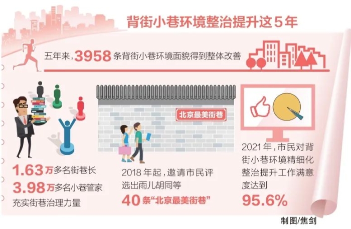 五年來,北京全市3958條背街小巷環(huán)境面貌得到整體改善;1.63萬多名街巷長(zhǎng)、3.98萬多名小巷管家充實(shí)街巷治理力量;自2018年起,邀請(qǐng)市民評(píng)選出了雨兒胡同、府學(xué)胡同、鷂兒胡同、韶九胡同等40條“北京最美街巷”[5];首都文明辦、北京市城市管理委、北京市規(guī)劃和自然資源委命名了施家胡同、模式口南小街、祿米倉(cāng)西巷等663條首都文明街巷[6];北京歷史文化名城保護(hù)委員會(huì)辦公室2022年正式公布了磚塔胡同、史家胡同、楊梅竹斜街、百花深處等598處首都功能核心區(qū)首批傳承悠久、具有相對(duì)完整歷史信息和較高歷史文化價(jià)值的街巷胡同傳統(tǒng)地名保護(hù)名錄[7]。市民對(duì)背街小巷環(huán)境精細(xì)化整治提升工作滿意率達(dá)到95.6%。