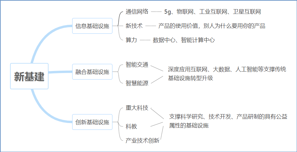 根據國家發展改革委的定義,新基建是以新發展理念為引領,以技術創新為驅動,以信息網絡為基礎,面向高質量發展需要,提供數字轉型、智能升級、融合創新等服務的基礎設施體系,包括信息基礎設施、融合基礎設施、創新基礎設施。