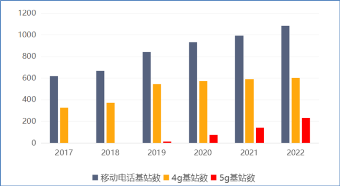 圖2 2017-2022移動電話基站發展情況(單位:萬座)
