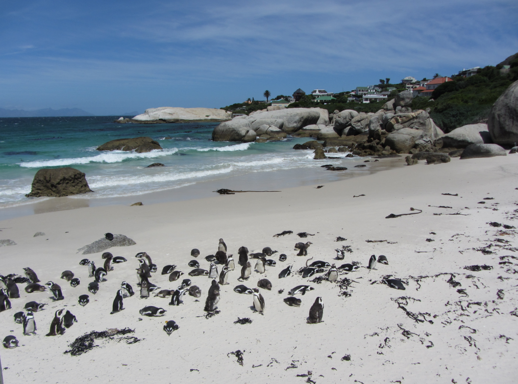 企鵝灘保護區位于開普敦西蒙鎮的博德斯海灘(Boulders Beach)。這里的企鵝身材瘦小,喙前端有一圈淡白色的圓環,整個足部以下全為黑色,只在非洲大陸南端的開普敦海域出現,故名斑嘴環企鵝、黑足企鵝、非洲小企鵝。1910年時非洲企鵝約有150萬只,上世紀初期開普敦附近水域數起沉船漏油事件污染了企鵝的居住地,使得大部分企鵝死亡,只剩下不到原數量7%的非洲小企鵝得以生存與繁殖。1982年,2只非洲小企鵝來到博德斯海灘安家,當地居民自發進行保護,1983年,建立博德斯企鵝保護區。到2005年,這里的企鵝數量已達到3900只。受棲息地破壞、原油泄漏和其他海洋污染、氣候變暖導致魚群變遷及本地動物的傷害、過度捕撈、大量旅游活動沖突等因素影響,到2011年,保護區內還剩下2100只企鵝。目前又逐漸恢復到3000多只[2]
