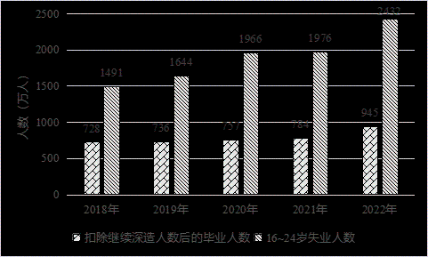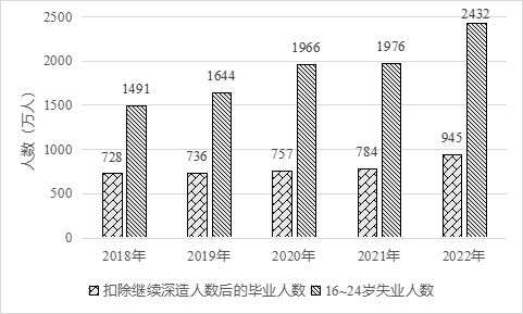 (二)供需錯配進一步加劇失業風險。一是部分行業用人需求出現萎縮。根據普查數據,有近50%的青年人就業主要集中在制造業、批發零售、住宿餐飲等行業,但是近年來受疫情沖擊,居民消費需求恢復緩慢,住宿餐飲等服務行業收縮明顯,同時勞動密集型制造業與低端制造外遷,致使其吸納就業能力下降,對青年群體尤其是低學歷青年就業形成拖累。二是畢業生供給持續創新高。每年高校畢業生人數都在持續遞增,2023年高校畢業生已經達到1158萬人,比本世紀初高出十倍之多,剔除考公、考研、出國的人數,預估仍將有950萬應屆生進入職場,激烈程度每年只增不減。再加上近年外國留學人員回國求職人數上升,進一步增加了青年求職群體的就業壓力。三是結構性矛盾突出。一方面,青年學生就業觀不實際。很多畢業生對就業環境、行業、城市的期望與實際勞動力市場提供的條件存有落差,青年不再愿意入職傳統的制造業工廠,甚至出現“3000元工廠招不到藍領工人,寫字樓卻可以招到大學生”的說法。并且近年來越來越多畢業生競爭有限的公職崗位,耽誤了最佳的就業時機。另一方面,知識和能力跟不上需求。在信息密集型服務業、知識密集型服務業等領域,眾多低學歷青年的知識儲備和能力無法滿足企業要求。此外,當前高校的教育與社會需求脫節,導致人才培養滯后于產業結構調整和市場需求變化。