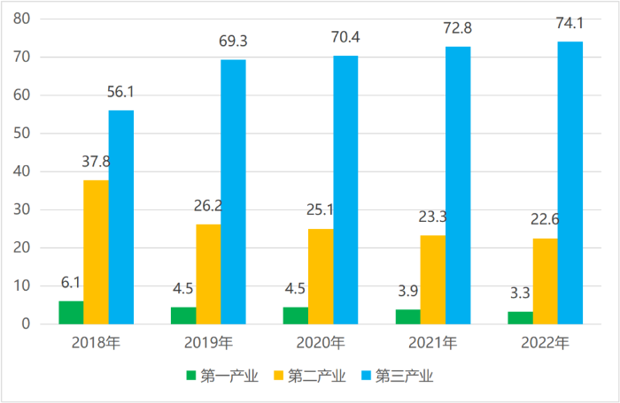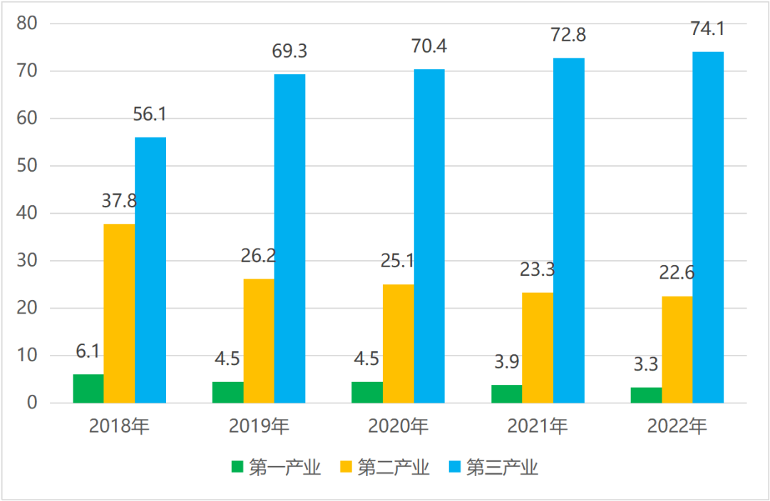 數據來源:2018年-2021年平谷區統計年鑒,2022年平谷區國民經濟和社會發展統計公報。圖1 2018年-2022年平谷區三產占地區生產總值比重情況