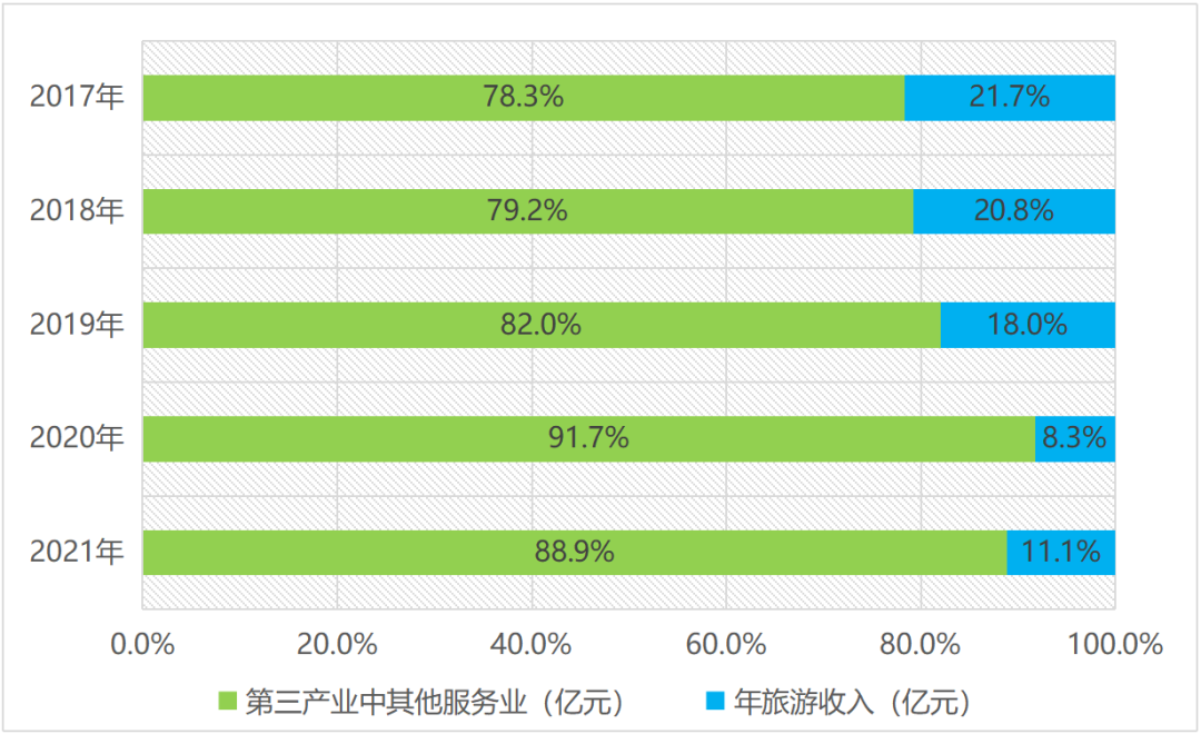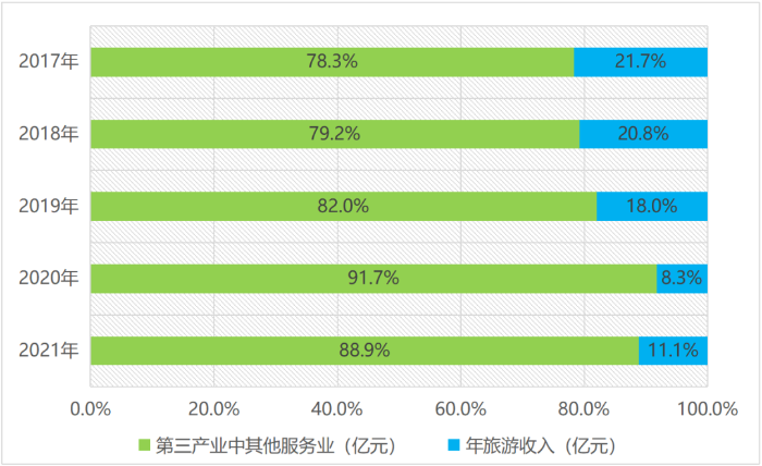 數據來源:2018年-2022年平谷區統計年鑒,2022年北京文化和旅游統計概覽。圖2 2017年-2021年平谷區旅游收入及其他服務業占第三產業產值比重情況
