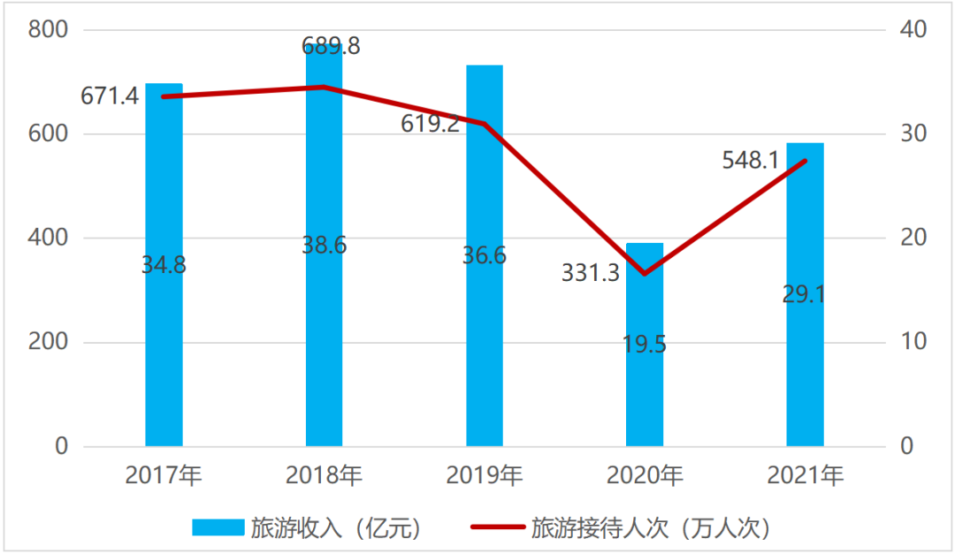 數據來源:2017年-2021年北京市分區旅游數據統計報告。圖3  2017年-2021年平谷區旅游收入及接待人次情況