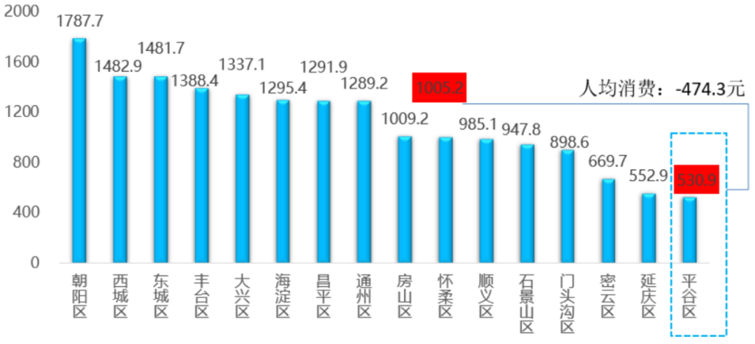 2021年,平谷區游客人均花費530.9元,排名全市倒數第一。與生態涵養區中人均花費水平最高的懷柔區相比,相差474.3元,僅達到懷柔區的52.9%。此外,平谷區游客人均花費也低于全國平均水平,相差368.4元。