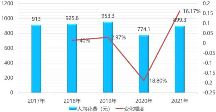 數據來源:中國旅游行業發展趨勢調研與投資前景分析報告(2022年-2029年)。圖8 2017年-2021年全國游客人均花費情況