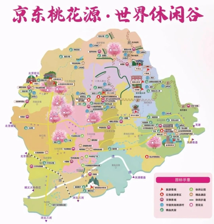 平谷區是中國著名的大桃之鄉,大桃種植面積22萬畝、年產近2億公斤,被譽為“世界最大的桃園、中國最大的桃鄉、首都最大的果區”。大桃產業是平谷區的特色產業、富民產業、綠色產業和生態產業,具備良好的經濟、生態和社會效益。桃花成為平谷區花,“桃花節”成為平谷固定節日,已經成功連續舉辦13屆,成為京津冀地區炙手可熱的春季旅游活動。2019年平谷區榮獲首批“國家全域旅游示范區”,通過創建活動,無障礙環境建設、精品民宿工程、旅游交通道路工程等一批重點項目得以落地實施,極大地改善了全域旅游環境,游客量激增。2020年世界休閑大會又在平谷成功舉辦,吸引國際國內眾多游客往來平谷,極大程度上提升了平谷旅游的市場認知度和知名度。