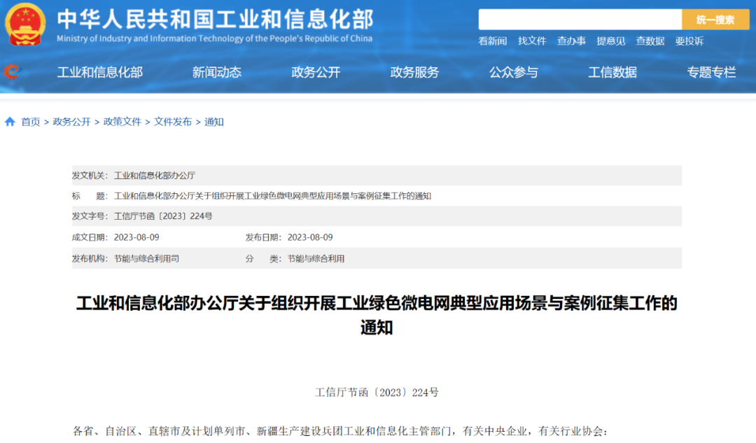 2023年8月9日,工業(yè)和信息化部發(fā)布《關(guān)于組織開(kāi)展工業(yè)綠色微電網(wǎng)典型應(yīng)用場(chǎng)景與案例征集工作的通知》《工信廳節(jié)函〔2023〕224號(hào)》,聚焦鋼鐵、有色、石化、化工、建材、機(jī)械、輕工、紡織、電子以及數(shù)據(jù)中心、5G基站等重點(diǎn)行業(yè)領(lǐng)域,征集一批集成應(yīng)用分布式光伏、分散式風(fēng)電、高效熱泵、新型儲(chǔ)能、氫能、余熱余壓利用、智慧能源管控等一體化系統(tǒng)的工業(yè)綠色微電網(wǎng),為廣大工業(yè)企業(yè)和工業(yè)園區(qū)提供典型示范場(chǎng)景和實(shí)踐案例。