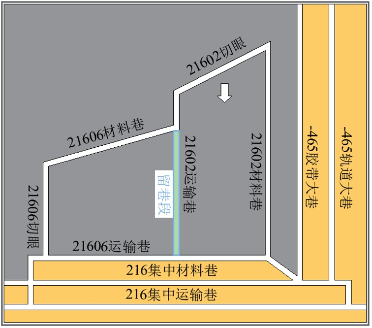 為緩解工作面采掘接替緊張,對21602工作面運輸巷部分區段進行沿空留巷作業,將其作為21606工作面材料巷,沿空留巷區段如圖1所示。運輸巷沿煤層頂板掘進,為半煤巖巷道,巷道斷面為矩形,凈高4m,凈寬2.6m。