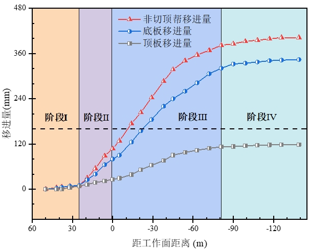 1.階段Ⅰ:超前工作面20m之前。巷道上覆巖層保持較好的完整性,圍巖結構處于相對穩定,幫部及頂底板未見明顯變形,下工作面側幫部累計變形量為10mm,底板累計變形量為12mm,頂板累計變形量為8mm。