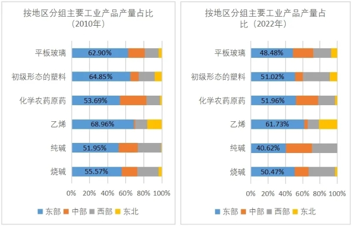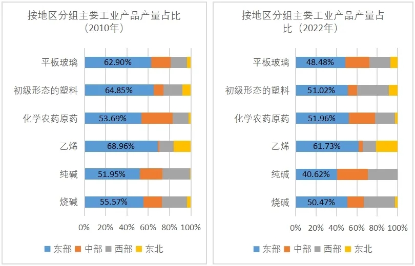 隨著城市化的不斷推進和經濟的快速發展,東部地區能源、土地、環境等要素供給日趨緊張,碳排放的限制也會加快部分高耗能產業向原材料豐富、新能源富集的中西部地區疏散轉移。近年來,全國電解鋁“北鋁南移、東鋁西移”,云南依托可再生能源資源優勢主動承接電解鋁產能轉移,全省電解鋁產能接近全國的五分之一。全國實施“東數西算”工程,8個國家算力樞紐節點西部地區占據5個,10個國家數據中心集群西部地區占據7個。此外,玻璃、塑料及化工產品產業,受東部地區環境容量和環境監管限制而向中西部地區轉移。2010-2022年,東部地區平板玻璃、初級形態的塑料、化學農藥原藥、乙烯、純堿、燒堿等主要工業產品產量占全國比重分別下降14、14、2、7、11和5個百分點,而西部地區占比分別上升5、13、4、0.2、3和7個百分點。
