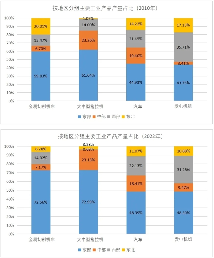 隨著我國基礎設施建設大發展,中西部交通運輸條件與東部的差距在不斷縮小,特別是互聯網、移動通信等新型基礎設施的發展,使得企業可以在不同地區通過遠程辦公、在線會議等進行業務協作和管理,“遠程研發+異地中試+異地生產+異地操作”等模式應運而生。以汽車產業為例,國內知名車企相繼進入中西部,在重慶、成都、武漢、長沙、鄭州等地建成了相當規模的整車和零部件生產基地,但其研發中心依然設置在東部沿海發達地區。同時,中西部和東北地區也可以通過在東部地區設立研發基地,快速獲取發達地區人才、區位、資金優勢。此外,東北和西部地區部分傳統優勢產業出現向東部地區轉出的現象。2010-2022年,東北地區金屬切削機床、汽車和發電機組等主要工業產品產量占全國比重分別下降14、3和6個百分點,西部地區大中型拖拉機占比下降13個百分點;而同期東部地區金屬切削機床、大中型拖拉機、汽車和發電機組等主要工業產品產量占比分別上升13、11、3和5個百分點。