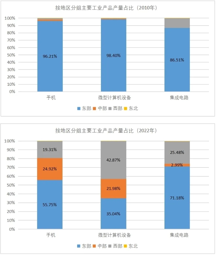 我國產業轉移的結構不斷升級,中西部地區除主要承接東部地區調整優化的勞動密集型產業外,還積極利用產業基礎和資源稟賦優勢,加大電子信息等資本密集型和技術密集型產業承接力度,整體呈現出產業轉移與產業升級并行趨勢。近年來,戰略性新興產業也開始向中西部核心城市集聚,如合肥芯片產業、武漢光纖通信產業、西安半導體產業、重慶新能源汽車產業等。2010-2022年,我國東部地區手機、微型計算機、集成電路等主要工業產品產量占全國比重分別下降40、63和15個百分點;而中部地區三種產品占比分別上升23、21和3個百分點,西部地區三種產品占比分別上升18、42和12個百分點。