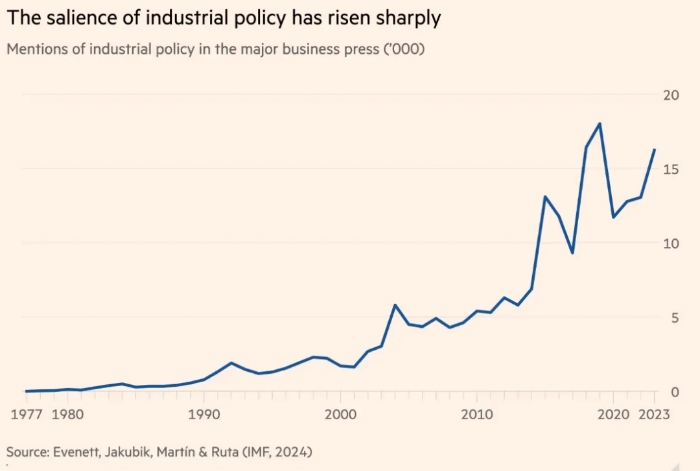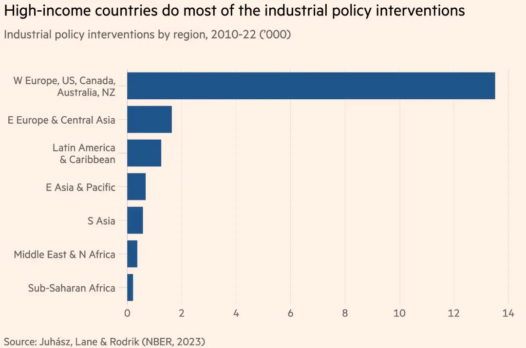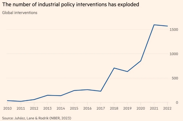 有證據表明,產業政策作為一種理念和實踐都變得更加普遍。國際貨幣基金組織去年 1 月發布的《產業政策回歸數據》顯示,過去十年,商業媒體中對產業政策的提及顯著增加。美國國家經濟研究局發表的一篇關于《產業政策的新經濟學》的論文由雷卡·尤哈斯、內森·萊恩和丹尼·羅德里克共同撰寫,論文顯示,全球產業政策干預措施急劇增加,從2017年的228項增加到2022年的1568項——主要是在高收入國家(可能是因為它們有更多的財政空間)。這也讓世界其他國家指責它們虛偽。(見圖1)