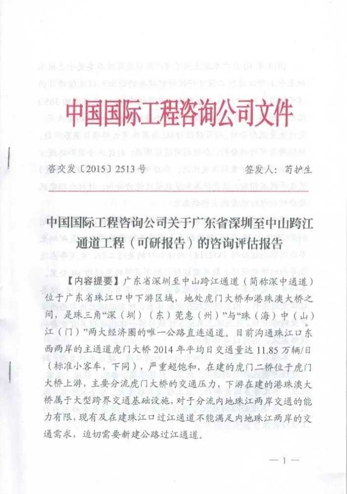 七年磨一劍,鏖戰珠江口。 飛架伶仃洋,天塹變通途。 6月30日,舉世矚目的國家重大工程深中通道正式建成通車。習近平總書記致信祝賀,并向參與規劃建設的全體同志致以誠摯問候。賀信中寫道:“深中通道是繼港珠澳大橋后粵港澳大灣區建成的又一超大型交通工程,攻克了多項世界級技術難題,創造了多項世界紀錄。全體參與者用辛勤付出、堅強毅力,高質量完成了工程任務。這充分說明,中國式現代化是干出來的,偉大事業都成于實干!” 全長約24公里,總投資446億元的深中通道在環珠江口“A”字形交通主骨架上挺起關鍵一“橫”,成為全球首個集“橋、島、隧、水下互通”為一體的跨海集群工程。通車后,深圳至中山的車程從2小時左右縮短至30分鐘。自此,深中兩地“雙向奔赴”,攜手進入“一小時經濟圈”,廣佛肇、深莞惠、珠中江三大珠三角都市圈聯結更加密切,推動了粵港澳大灣區高質量發展加速駛入快車道。 世界最大跨徑(1666米)全離岸海中鋼箱梁懸索橋、世界最高通航凈空高度(76.5米)、世界最大海中錨碇(100萬噸)、世界橋梁最高顫振臨界風速(88米/秒)……深中通道創造了十多項世界紀錄,形成了“鋼殼-混凝土沉管隧道設計方法”等10項世界領先技術。獲得發明專利200余項、行業協會獎項數十項,并屢獲國際贊譽:2024年4月,深中大橋榮獲國際橋梁大會“喬治·理查德森獎”,深中隧道入選“全球隧道與地下工程領域50項標志性工程”。 這樣一項屢創紀錄、成于實干的超級工程背后,凝結著上百家參建單位、上萬名建設者的汗水和智慧,中國國際工程咨詢有限公司(以下簡稱“中咨公司”)便是其中一員。作為國家高端智庫和國內規模最大的綜合性工程咨詢機構,中咨公司牢記“服務國家 貢獻社會”的初心使命,始終胸懷“國之大者”,助建“國之重器”,全程參與深中通道的建設論證,中咨人攻堅克難,勇于擔當,敢于創新,用實際行動詮釋了“公正、科學、可靠、敢言、多謀、慎斷”的中咨精神,為工程保駕護航,作出了重要貢獻。 使命召喚,責無旁貸 深中通道建設勢在必行 十年彈指一揮間,不負韶華不負己。2014年12月,受國家發展改革委委托,中咨公司開展《深圳至中山跨江通道可行性研究報告》(以下簡稱《可研報告》)的咨詢評估工作,評估重點包含以下方面:交通流量流向分析;項目建設時機;與港珠澳大橋項目關系問題;公鐵兩用可行性分析,合理利用通道資源;起訖點方案和路線方案;橋梁隧道方案同深度比選;合理確定車道數和橋梁(隧道)寬度等技術指標;投資估算和貸款償還能力分析;對社會穩定風險分析和評估報告提出咨詢意見。 使命召喚,責無旁貸。中咨公司高度重視深中通道評估工作,迅速成立組建專班,由時任中咨公司副總經理茍護生,原交通業務部主任佘湘耘,時任交通業務部主任助理姜青春,公路處處長(項目經理)宋小云、公路處申培華、徐進、王春苗等,并邀請涵蓋隧道、橋梁、水運、鐵路、公路、投資估算等方面專家,共同組成項目組,全力以赴做好評估論證工作。 2014年12月,中咨公司接受委托開展評估論證工作。 2015年1月,中咨公司組織由工程院士、設計等組成的評估組,在深圳召開現場咨詢評估會,評估認為本項目的通航安全影響行業主管部門尚未批復,現有建設方案存在很大的不確定性,建議待有關通航等問題明確后,確定工程方案。 2015年8月,交通運輸部出具《關于深圳至中山跨江通道項目航道條件與通航安全影響評價的審核意見》(交水函〔2015〕590號),明確各航道通航凈空和相關技術要求。 2015年10月,《可研報告》編制單位根據中咨公司咨詢評估會意見和交通運輸部關于通航影響的批復意見,對交通量預測、通航審批執行情況、工程實施范圍、投資估算及經濟評價等內容進行了進一步修改完善。 2015年11月,經過評估組研究并進行再次評估后,中咨公司關于廣東省深圳至中山跨江通道工程(可研報告)的咨詢評估報告正式提交國家發展改革委。 至此,歷時近一年的深中通道咨詢評估工作順利完成,評估組從建設必要性與建設時機、交通量預測、與港珠澳大橋的關系、技術標準及通航標準、建設條件、建設方案、建設規模及建設工期、建設用地和用海、環境和生態影響分析、投資估算和資金籌措、經濟評價、節能評價、社會評價、社會穩定風險分析與評估、風險評估等十多個方面對項目進行全方位評估論證。
