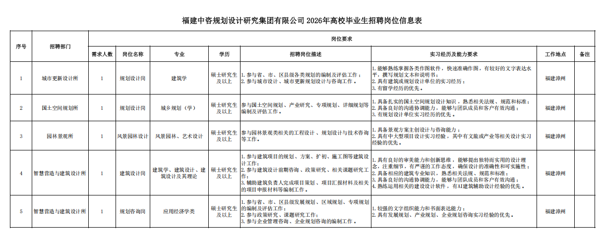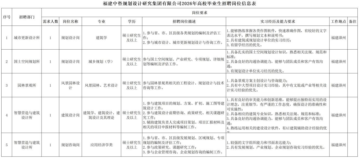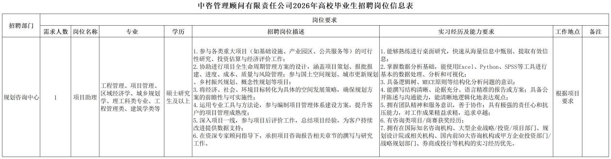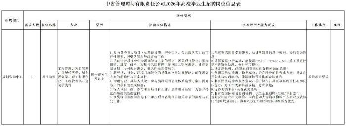 一、公司簡介 中咨工程管理咨詢有限公司(簡稱中咨管理)成立于1989年,是中國國際工程咨詢有限公司的核心骨干子公司,注冊資金1.55億元?,F有各項資質證書持證2800余冊,中高級職稱比例超50%。 中咨管理公司是國內從事工程管理類業務最早、規模最大、行業最廣、業績最多的企業之一,具有工程咨詢甲級資信、工程監理綜合資質以及設備、公路工程、地質災害防治工程、人民防空工程等多項專業監理甲級資質,并列入政府采購招標代理機構和中央投資項目招標代理機構名單。業務涵蓋工程前期咨詢、項目管理、項目代建、招標代理、造價咨詢、工程監理、設備監理、設計優化、工程質量安全評估咨詢等項目全過程咨詢服務,涉及房屋建筑、交通、石化、水利、電力、冶煉、礦山、市政、生態環境、通信和信息化等多個行業。業務遍布全國及全球近50個國家和地區,累計服務各類咨詢管理項目超過1萬個,涉及工程建設投資近5萬億元。曾榮獲56項中國建設工程魯班獎、15項中國土木工程詹天佑獎、64項國家優質工程獎、23項中國鋼結構金獎以及各類省級或行業獎項500余項。 經過30余年的不懈努力,我們積累了豐富的工程管理經驗,為各類工程建設項目保駕護航,“中咨管理”品牌成為行業的一面旗幟。我們崇尚簡單、包容、共享的理念,秉持創造價值、貢獻社會的使命和專業創造精品、價值成就客戶的核心價值觀,為成為全過程工程管理咨詢的領先者而奮斗。優秀的你值得更好的平臺,加入我們,攜手共創新篇章! 二、應聘條件 (一)2026年全日制本科及以上應屆畢業生。 (二)年齡要求:本科生26周歲及以下(2000年1月1日后出生),碩士研究生30周歲及以下(1996年1月1日后出生)。 (三)在校就讀期間無在職工作經歷,無社保繳納記錄和派遣落戶記錄。 (四)成績優秀,人品端正,積極進取,愿與公司共改革、奮進。 (五)具備扎實的專業理論知識和良好的溝通能力,實踐能力較強。 (六)熟練使用各類辦公軟件。 (七)簡歷需注明出生日期、生源地(即入學前戶籍所在地)。 三、應聘程序 發布招聘公告→簡歷投遞→簡歷篩選→筆試→面試→確定人選并公示→發放錄用通知。 四、崗位信息 五、報名方式 本次招聘報名采取在線填報方式進行:應聘者請使用Chrome內核瀏覽器(如:Chrome瀏覽器、360瀏覽器、百度瀏覽器、搜狗瀏覽器、UC瀏覽器等)登錄網站報名,網站鏈接:https://hcmcloud.ciecc.com.cn/recruit/#/index 或使用手機掃描二維碼: 中咨工程有限公司 一、 公司簡介 中咨工程有限公司成立于2010年,是中國國際工程咨詢有限公司(簡稱中咨公司)的控股子公司,由中咨公司和中國廣核電力股份有限公司合資成立。 公司作為中咨公司工程管理業務板塊的核心成員,主營業務為全過程工程管理(咨詢)服務業務,包括全過程中的各節點業務(1+X),業務范圍涉及石化、核電、冶金、交通和民用市政等多個領域行業工程項目的前期咨詢及咨詢管理、勘察管理、設計管理、監理、采購管理、造價咨詢、建造過程管理、項目管理(IPMT、PMC等)、項目代建和技術服務等。 公司以為國家、社會和股東創造價值為己任,以兩大股東提供的廣闊市場機遇和成熟先進的管理體系為發展驅動力,通過積極參與市場競爭,努力培育公司核心競爭能力,打造一支特別能戰斗的具有復合型人才的專業化隊伍,矢志發展成為具備承接大中型全過程工程管理(咨詢)服務業務能力的、具有國際競爭力的工程公司。 二、 應聘條件 (一)2026年全日制本科及以上應屆畢業生(部分崗位碩士研究生學歷),在校就讀期間無在職工作經歷,無社保繳納記錄和派遣落戶記錄,學習成績優良。 (二)良好的語言表達能力和溝通能力,執行力強,學習能力強,協作能力強。 (三)身體健康,具有良好的職業道德修養,具有較強的責任心。 (四)熟練使用常用辦公軟件,具有一定的文字功底。 (五)無違規違法記錄,無不良嗜好,身體素質好,能吃苦耐勞,能承受較大的工作壓力。 三、 招聘程序 發布招聘公告→簡歷篩選→資格審查→綜合能力測評→面試→確定人選并公示→發放錄用通知→入職。 四、 崗位信息 五、 報名方式 本次招聘報名采取在線填報方式進行:應聘者請使用Chrome內核瀏覽器(如:Chrome瀏覽器、360瀏覽器、百度瀏覽器、搜狗瀏覽器、UC瀏覽器等)登錄網站報名,網站鏈接:https://hcmcloud.ciecc.com.cn/recruit/#/index 或使用手機掃描二維碼: 中咨海外咨詢有限公司 一、公司簡介 中咨海外咨詢有限公司是中國國際工程咨詢有限公司所屬二級子公司,于1988年成立,經過30多年發展,為各級政府、企事業單位提供了萬余項咨詢服務,在國內咨詢領域具有一定知名度和較高信譽,具備較好的發展基礎。2021年入選國資委“管理標桿”企業,2022-2025年連續4年蟬聯國資委“雙百行動標桿”企業。 公司主要從事戰略謀劃、投資策劃、全過程咨詢以及規劃設計和建設投資管理經營五大業務。善于謀劃策劃創造發展新優勢,努力成為工程建設領域原創思想策源地;善于科學設計項目功能成本方案,致力成為國內優化設計領域先行者;善于系統提供區域發展整體解決方案,努力成為國內有影響力的具有研究特質的咨詢設計企業。公司為國家高新技術企業,擁有工程咨詢行業綜合甲級資信、15項專業專項甲級資信;公路、建筑、市政行業7項專業甲級設計資質;市政行業2項專業乙級設計資質;